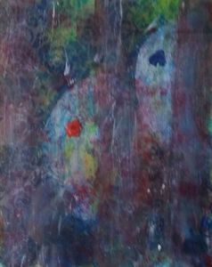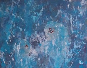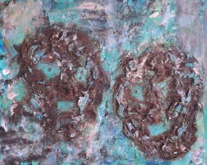 Een abstraherend schilderij geinspireerd op de oorsprong (embryo's). Het wordt ingelijst (wit) met passepartout geleverd.
